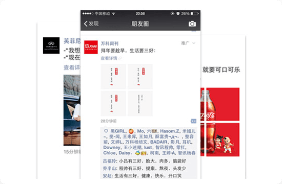 朋友圈广告将会通过微信广告系统进行投放和管理,广告本身内容将基于微信公众账号生态体系, 以类似朋友的原创内容形式进行展现,在基于微信用户画像进行定向的同时,依托关系链进行互动传播。